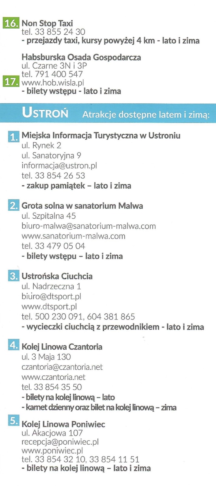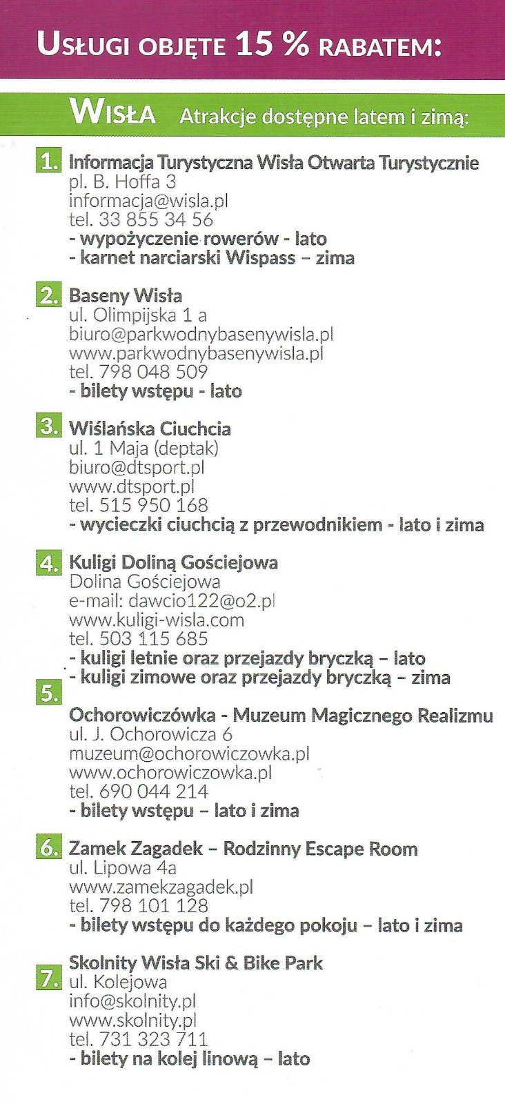 Jest nam bardzo miło że zdecydowaliście się na wypoczynek w Wiśle i jej okolicach. Dziękujemy również za wybranie naszego obiektu noclegowego. Rezerwując u nas minimum dwa noclegi otrzymujecie Państwo Kartę Rabatową programu „Wisła, Ustroń … zostaję dłużej – dostaję więcej”. Ta karta będzie Państwa upoważniała do otrzymania aż 15% rabatu na wybrane atrakcje turystyczne w regionie. Aktualna lista atrakcji jest publikowana na stronach internetowych Wisły – www.wisla.pl oraz Ustronia – www.ustron.pl. Jeszcze raz dziękujemy za wybór naszego obiektu i życzymy miłego wypoczynku w Beskidach.